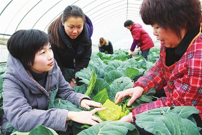 6年前,当崇明姑娘高慧辞去市区三级医院工作回家当农民时,周围许多人都向她投去了惊诧不解的目光,因为,这条劳心劳力的“泥道”对于一脸书生稚气的青春少女而言具有很大的挑战性。6年过去了,人们发现,这位当年医科高材生不仅将眼下这条“跨界”路走踏实了,且还走得很精彩,让人们当初的疑惑变成了对她的赞赏和羡慕。图为高慧(前左)在向母亲(前右)讨教“宝塔型”花菜的相关知识。