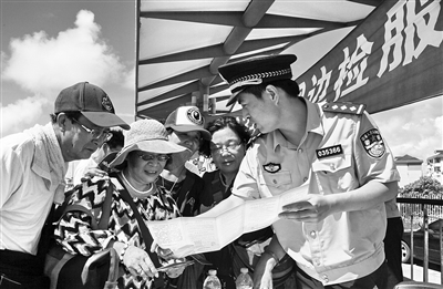 日前,金山边检站在金山城市沙滩举行2013年中国边检服务品牌集中宣传活动,向市民宣传边检机关便民服务举措和新近实施的《中华人民共和国出境入境管理法》。图为金山边检站民警向市民介绍边检机关便民服务举措。通讯员 庄毅 摄/文