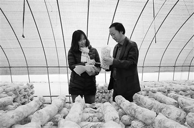 深冬时节,位于金山区枫泾镇的灿辉果蔬专业合作社香菇种植大棚内春意盎然,根根菌棒排列整齐,一朵朵浅褐色的香菇像小伞一样长在菌棒上,长势喜人。该合作社在两亩大棚内试种利用果蔬修剪枝条种植的香菇获得成功。图为农技站工作人员在温室大棚内查看记录菌棒生长发酵情况。通讯员 陈黎洁 摄/文