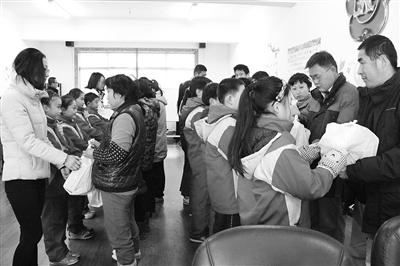 当龚路中心小学党员志愿者和少先队员走进阳光之家活动室时,围坐在会议桌四周的全体智障学员就热情地站立起来,挥手向师生们打招呼,脸上露出欣喜的笑容。党员志愿者和少先队员一起,向这些智障学员进行拜年,赠送新年大礼包,智障学员手捧礼物纷纷表示感谢。