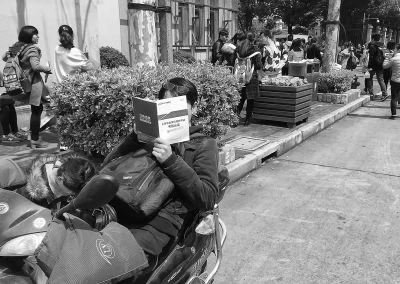 上周六,上海市二零一五年上半年事业单位招聘考试笔试在全市各考点举行。中午十二点十五分,离开考还有四十五分钟,长宁区新泾中学考点门口已有不少备考人员等待入场,一位考生半躺在助动车上,拿着一本“考前必读”做最后的复习冲刺。