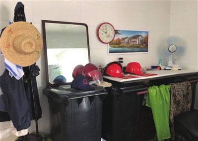 夫妻俩不仅会收拾,也会经营生活。每天上午十点以后是他们相对的“闲暇时光”。他们把垃圾房收拾得干干净净,一边专门摆放着数十只垃圾桶,另一侧则是他们温馨的“小家”。别人眼里的垃圾,到了他们手里就变成了“宝贝”。墙壁上,张贴着两幅装饰画,挂着一只钟;3只垃圾桶并排摆放,上面放块板,俨然成了一张高脚桌,上面放着电风扇、安全帽、大镜子等;旁边放着一只单人沙发。进门口的桌子则有点“高大上”,仔细一看,原来是只废弃的“美容床”,上面横放一块浴室玻璃门,放着茶杯、茶叶、热水瓶、餐巾纸盒等,旁边的电风扇摇曳着,夫妻俩一个坐在沙发上,一个坐在椅子上,喝茶聊天,十分惬意。有人还调侃说:“这个垃圾房就差只床了!”