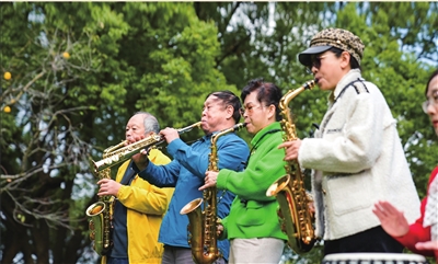 申城初冬的暖阳下,几个退休老友约好了时间在一个草坪上,萨克斯、短笛、鼓等乐器样样俱全、各司其职,共同演奏着一首首乐曲,成为公园内别样的风景。(图为记者日前在辰山植物园内拍摄。) 记者 袁梓涵 摄文
