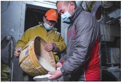 在百余平方米的碾米作坊里,弥漫着稻谷的沉香,也随处可见布满岁月记忆的老物件,用来盛放稻谷的箩筐、老式磅秤、布满粉尘的碾米机……伴随着阵阵机器轰隆声,徐师傅熟练地将稻谷投入机器,一粒粒稻谷经过自动传输、去杂、振动筛选、谷糙分离、筛除碎米、碾白……最终,晶莹剔透、圆润饱满的新鲜大米从机器中流出,珍珠般的大米汇集宛如一条白色瀑布,完成稻谷到大米的转变,家家户户一年的口粮有了着落。
