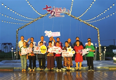 当天的音乐会开始前,12对夫妻乘着三辆观光车游览了美丽的村容村貌,虽是雨中行,但有缕缕稀疏雨丝的滋润,使这个“七夕”节倒有别样一番情味。活动现场被布置得温馨、浪漫,一对对夫妻手持红色玫瑰与荧光道具,沉浸在甜蜜浪漫的氛围之中,烛光摇曳、美妙的音乐与歌声不时从舞台上传来,倾诉着一个个关于“七夕”的美丽传说。男耕女织、鹊桥相会等生动的故事讲述,展示着民间百姓的勤劳奋斗与真挚的爱情承诺,这也是外灶村组织老年朋友过“七夕”节的落脚点和出发点。现场主持人不时与一对对老年夫妻互动,在这样现场氛围的感染下,有的夫妻来了个深情的拥抱、有的向爱人大声表白“我爱你”、有的走上舞台一展歌喉唱情歌……村里有了老年人“七夕”节,老人们放开了,并喊出了多年没有过的心中表白,场面浪漫又温馨。