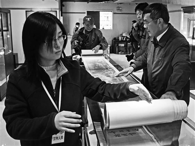 十二月二十四日下午,『中国发绣艺术珍藏品荟展』在本市南京东路五五八号上海旅游品商厦八楼珍宝馆拉开帷幕。发绣被誉『东方一绝』,精美的展品令观众感受到中华传统文化的无限魅力!图为工作人员正在展示发绣作品《清明上河图》。