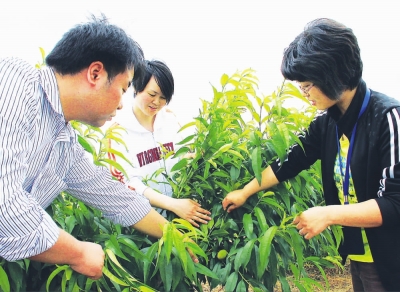 “80后”、“村官”、“党代表”,这是解读奉贤区青村镇花角村党支部副书记张瑜的三个关键词。四年前,毕业于上海工程技术大学的张瑜,成为奉贤区青村镇第一批被录用的大学生“村官”;为了帮助当地果农解决销售难问题,张瑜带头创办了奉贤第一个由“80后”大学生“村官”组建的专业合作社;市第十次党代会上,张瑜不仅是奉贤区最年轻的一位参会代表,还是全市备受关注的20名“80后”党代表中的一分子。图为张瑜(中)正与自己的搭档在新建的合作社黄桃种植基地察看桃树的生长情况。