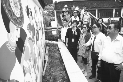 上海金山旅游目的地品牌发布会暨“金周末”体验游首发仪式日前在上海旅游集散中心举行。据悉,“闲是金山”以“金周末”品牌为抓手,为大家提供一个品质周末的旅游全程体验。图为体验游首发仪式后,首批来自长宁区的市民在金山区金山嘴渔村观看渔民绘画展示。