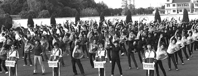 本报讯 稻浪流金,丹桂飘香。10月26日下午,崇明县竖新镇2012“我们的节日”文化系列活动闭幕式暨市民运动会颁奖典礼在新光中学运动场隆重举行。由村(居)、两新组织组成的32支运动员代表队精神抖擞、意气风发,迈着矫健的步伐走进会场;球场上,健美操、广场舞、广播操(如图)等展示轮番上演,运动员们尽展风采,精彩纷呈。