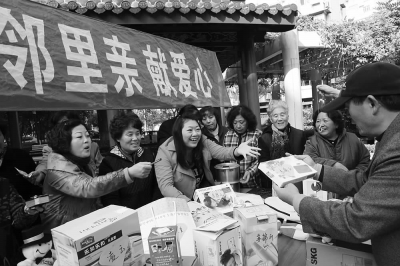 “从今年一月开始,我们每个月举办一次这样的活动。这次党的十八大提出要‘大力推进生态文明建设’,强调要‘全面促进资源节约’。我们对活动的意义有了更进一步的认识,也更加增添了我们开展这个活动的积极性。这次街道机关政工党支部干部知道我们开展活动,也纷纷献爱心,捐了不少东西。”济阳二村党总支书记胡慧芬告诉笔者说。图为爱心义卖摊位前,居民们在购物。