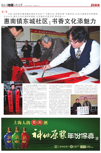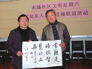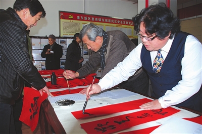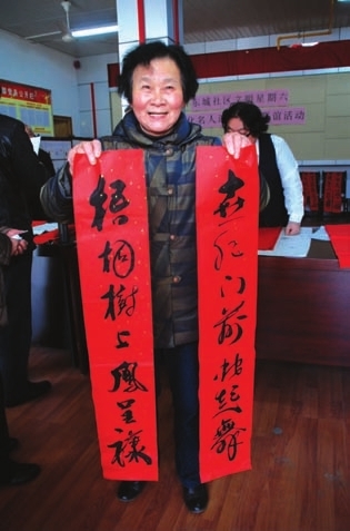 东城居委底楼活动室的长桌上,书画家图腾鸿、汪欣等饱蘸浓墨,在红色条幅上为老人书写春联和“福”字。“梧桐树上凤呈祥,世纪门前蛇起舞”,73岁朱阿婆拿着图腾鸿题赠的大红春联和“福”字,高兴地说:“书法家写的比买的还好!”