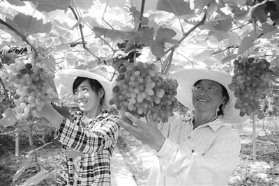 记者在绿油油的葡萄园里看到,串串珍珠翡翠似的挂果,处处可闻带着甜味的清香。“金黄色的是金手指,紫黑色的是夏黑,翠绿色的是醉金香。”杨总介绍着一个个新品葡萄。只见栽种在大棚内的金手指葡萄,串串沉甸甸的挂果,果粒排成紧密的“队形”,每串葡萄大小一致。