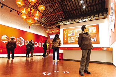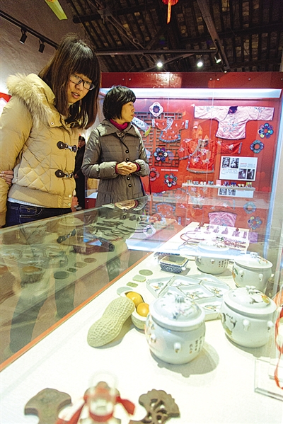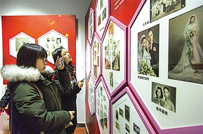博物馆内,首先映入眼帘的是一幅大红水乡婚典剪纸图。记者看到,一旁玻璃幕墙上,“情投意合、同床共枕、永结同心;成对成双、青梅竹马、生死不渝”等200条风俗成语,把结婚的真谛描述得淋漓尽致。走进展厅大堂内,旧时代的太师椅、八仙桌、花轿、婚房占据了半个房间。婚房里放满了具有当时年代特色的各种嫁妆,如脚炉、壁橱、浴香桶等。而一张雕刻精致的婚床则摆在最显眼的位置。据介绍,这张婚床又名千工床,造于明末清初,已有数百年的历史,当时一个技术精湛的木工也要花上3年时间才能做出这样一张床。“这么多年过去了,这里展示的好多东西有些我们自己也都找不到啦!”一位老年游客对一边的妻子感慨道。“这婚俗馆不错,也让年轻人了解一下我们当时结婚的样子,‘三大件’之类的,他们肯定不知道是什么东西啦。”在场上了年纪的游客纷纷回忆起当年喜结良缘时的情景。此外,博物馆还展出了百余年来的各式结婚证明。最早的一张“婚书”是清光绪44年9月24日的一张合婚证书,上书“金玉满堂、长命富贵”八个大字,再是合婚人、证婚人、介绍人签名盖章。而年轻人则对馆内展示的各个年代的结婚照颇感兴趣,有的还拉着父母要听他们当年结婚时的故事。