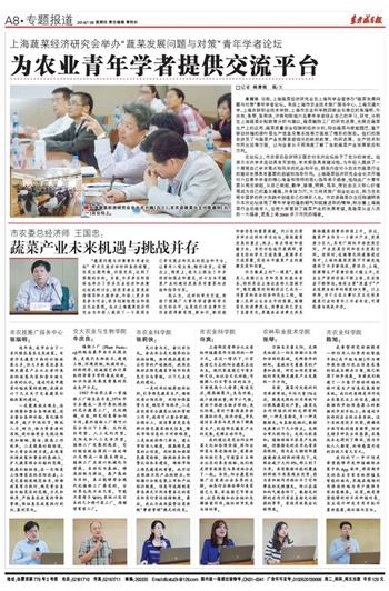 本报讯 日前,上海蔬菜经济研究会在上海科学会堂举办“蔬菜发展问题与对策”青年学者论坛。来自上海市农业技术推广服务中心、上海交通大学、上海农林职业技术学院、上海市农业科学院四家会长单位的张瑞明、牛庆良、张琴、张莉侠、许爽和陈旭六名青年学者结合自己的学习、研究,分别在上海蔬菜补贴政策分析与建议、蔬菜植物工厂的研究进展、光照在蔬菜生产上的应用、蔬菜质量安全控制的经济分析、阳台蔬菜与家庭园艺、基于移动终端的绿叶菜生产信息采集系统等方面做了精彩的报告。他们的报告涉及了与蔬菜产业发展紧密相关的政府政策、科研进展、生产技术和市民生活等方面,让与会者从不同角度了解了当前蔬菜产业发展前沿和方向。