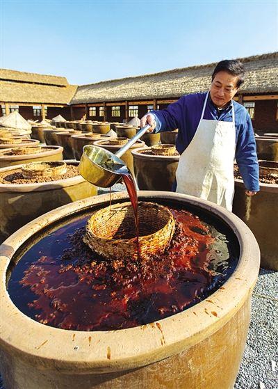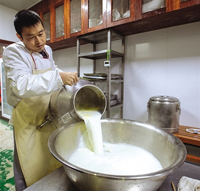 鸡、鸭、牛、羊等肉食能够自给或许还不是很稀奇,但在生态园内的牛棚里竟然还悠闲地躺着好几头奶牛。没错,这里卖的牛奶也是通过现挤后经过高温杀毒的纯天然产物。记者发现,生态园的餐厅内只提供牛奶、豆浆、米酒、生啤、酸奶等饮品,只有生啤是外面进货的,其他都是自制的。“雪碧可乐之类的软饮料,我们这边买不到,顾客要喝只能自己带。”工作人员解释说。最让记者感到意外的是,这里连做菜用的酱油都是自己酿造的。在生态园中部的一块空地上,几十口大缸分为四排整齐排列着,沥江专门雇佣了一位酿造师傅专职于酱油酿造工作。春去冬来要经过一年的时间才算酿造完成。“我们的酱油盐度很高,达到了39%,比市售酱油更不容易坏。”酿造师傅告诉记者。