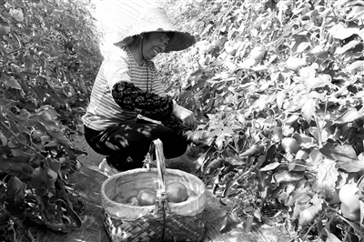 今年王剑峰种植3亩小番茄,预计产量每亩4000斤;3亩大番茄,预计产量每亩6000斤。这些大小番茄,色泽自然,口感沙糯鲜甜,深得市民欢迎。图为合作社员工在采摘“哲优大番茄”。
