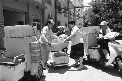 29日中午,笔者顶着烈日来到上钢街道老人助餐中心采访送餐员,12点15分,58岁的送餐员钱大龙刚送完餐回到了助餐中心,此时他全身湿透了。“今天,我把饭送到张奶奶家,她送我一条毛巾。”大龙十分感激老人的一片心意。同样是58岁的送餐员王伟国告诉笔者,他们六个送餐员每天每人要送五十户老人,从一楼到六楼都有,因为好多是八九十岁的老人,顺便帮老人家门口的垃圾带走,或帮老人换灯泡等是大家习惯的事情。就他送餐的就有两位102岁的老人,他更是要十分小心地把饭菜一定送到老人手中,千关照、万关照后才走。