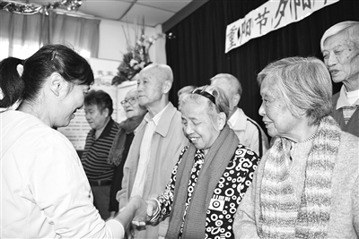 志愿者姐妹们说,她们每天花一点时间编织毛线,不仅能够换来老人们的温暖,而且自己也可以从中体会到奉献所带来的快乐。图为志愿者正在为老人送上自己编织的“暖心”围巾。