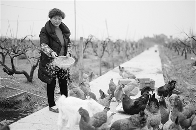 宋月华饲养的鸡在当地被称为“奔跑的桃园鸡”。近年来,枫泾镇大力发展黄桃产业,但黄桃的销售季主要是在八九月份,到了冬季,除了日常的养护,地里的农活并不多。为了不让自己闲下来,宋月华就想到了在果园里养些鸡、鸭、鹅。没想到这些家禽散养在大田里后,肉质、羽毛都比原先圈养的好,不仅味道鲜美,而且鹅毛、鸭毛还能卖钱。这第一批散养的家禽被卖出后,在当地赢得不少回头客。采访当天下午,一位市区来的陈女士正巧到宋月华的合作社,直言是奔着“田园鸡”来的。“这个礼拜阿拉小孙子回来,买两只鸡烧来吃吃。”陈女士笑着说道。