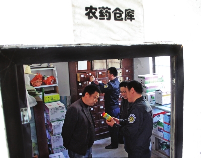 在执法过程中,执法大队还重点走访查看了那些尚在起步阶段较为粗放的合作社里的农资库存动态,了解合作社里市、区补贴农药的规范使用执行情况,以防止出现外购不合格农药等违规现象发生(如图)。同时,执法人员还查看合作社里的田间档案记录,特别询问了农药、化肥出入库的记录情况,以督促合作社自觉规范生产行为。