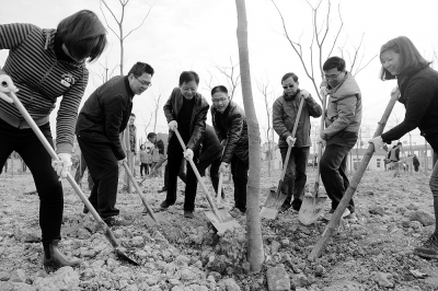 本报讯 日前,借着植树节的契机,闵行颛桥镇在中心村举办了以“义务植树共建和谐家园,植绿护绿共创文明城区”为主题的春季义务植树活动。当天早上9点,来自颛桥镇机关事业单位、居(村)委和企业的300多名志愿者就已到场,拿着准备好的铲子,分组进行植树(见图)。半小时内,在近万平方米的空地上种下了香樟、乌桕、榉树、广玉兰等乔木520余株。一棵棵树木迎着和煦的春风,再添一片生机勃勃的绿色。