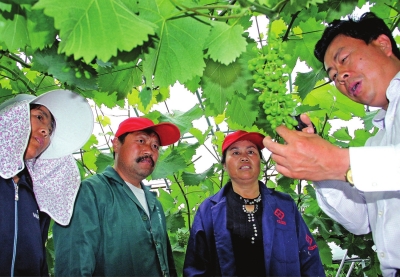 疏果是确保葡萄品质的最重要一环,然而也是最易被农户们所“忽视”的一个薄弱环节。一些农户由于受传统农业束缚影响较深,加上担心销售难,对提质增效往往缺乏足够的信心,而会偏向“便宜即好卖、增产即能增收”这样一种保守的逻辑思维,疏于疏果工作。对此,排名金山名优瓜果品牌序列之首的施泉葡萄负责人卢玉金常会主动跑到各种植基地田头进行实地宣传,并手把手地耐心指导农户疏果,通过发挥领头羊的作用,将越来越多农户带上了科学种植的轨道(如图)。