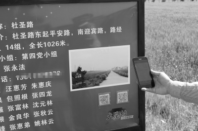 本报讯金山区朱泾镇大茫村的杜圣路是一条党员示范路,这条路的起始点竖着一块关于道路整洁管理的指示牌,上面有着党员“护路”小组负责人及组员的名单和联系方式。记者用手机扫了一下牌上的二维码,还能显示这名“护路”组长在什么时候来这里巡查过(如图)。