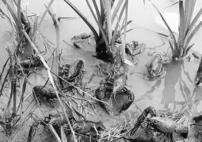 (4)为保证存活率,在稻田改造完成后用石灰消毒,7-9月陆续就近引进种虾,每亩放种虾50斤;如果是引进虾苗,一般只在早春4-5月份进行,每亩投放5000只左右幼苗。