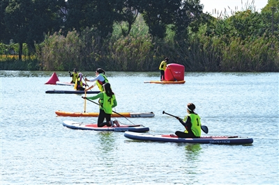 午后的金坞半岛水面波光粼粼,随着裁判的开赛号令响起,参赛队员从起点出发,快速挥动划桨,在宽阔的水面上乘风破浪。据了解,桨板运动融合了划桨、滑行、平衡等多项元素,近年来吸引了大批运动爱好者和群众的参与。而皮划艇作为奥运会、亚运会及全运会的正式比赛项目,具有很强的竞技性和观赏性。如今,以皮划艇为代表的水上运动项目正从专业赛场走进千家万户。