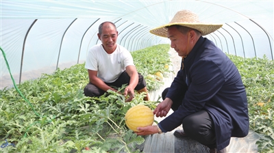 为了确保西甜瓜的品质,他将头茬瓜成熟采摘期安排在4月下旬。因为坐果太早,天气冷,瓜长得小,质量一般;坐果晚一点,气温升高了,生长旺盛,不仅果实大,更重要的是质量好。同时,西甜瓜秧苗是分批种植的,这样可以错开上市时期分批成熟。