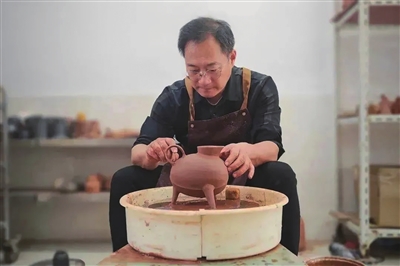 亭林黑陶数量多、器型美,但在20世纪90年代末,关于亭林黑陶的研发曾戛然而止。亭林黑陶制作技艺的“失传”让一直钟情于中国传统文化艺术的宋秋军倍感遗憾,他四处探寻黑陶遗迹,寻找现存黑陶技艺,并拜友人朱希为师学艺,再到后来,成为亭林“黑陶制作技艺”代表性传承人。