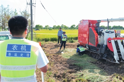 本次应急演练模拟场景为:泥城镇乡育南泥湾田块内,驾驶员驾驶联合收割机进行水稻收割作业,在倒车过程中撞到捡拾稻穗的村民,造成该村民受伤。在事故处理过程中,农机事故处理人员、医务人员、保险勘查人员分工明确、配合紧密,依次完成事故报案与受理、人员救护、现场勘查与处理、保险勘查、事故处理意见讨论及报告等环节,高效有序完成了本次农机“事故”的应急处置。