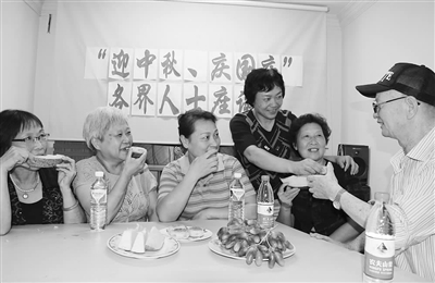 “没有共产党就没有新中国,没有……”9月19日上午,在上钢社区德州四村召开了“迎中秋、庆国庆”各界人士座谈会上,50余位离休老干部、少数名族代表,在品尝月饼的同时用歌声来歌唱伟大的祖国、伟大的党。部分老同志的子女在国外,在座谈中,他们更是渴望家人的团圆,民族的团结,祖国领土的统一伴随着下一个“中秋、国庆”佳节能早日到来。图为老人们高兴地接过居民区党总支书记送上的月饼。