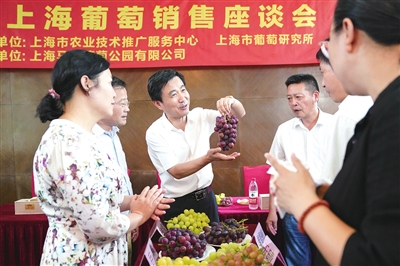 ■ “从品种来说,‘经典款’巨峰和‘网红款’阳光玫瑰搭配包装堪称绝配,一直深受欢迎。”8月23日下午,由上海市农业技术推广服务中心、上海市葡萄研究所主办的2019年葡萄中晚熟品种展示暨上海葡萄销售座谈会举行,来自市农业农村委、嘉定区农业农村委,市农技推广服务中心、各区农技推广机构,高校专家,各涉农区葡萄种植单位代表齐聚马陆葡萄主题公园,共同品鉴中晚熟葡萄品种,研讨销售形势,把脉上海葡萄产业高质量发展。记者 张树良 摄