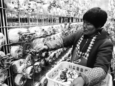 在昏暗的出菇房内,一排排出菇架直抵屋顶,架子上整齐摆放着一个个菌包。合作社的菌类并不是传统的土地栽种,而是靠这样一袋袋菌包,培养料经过灭菌、栽种原种、培养等工序之后,就放到出菇房里,经过人工对灯光、温度、湿度的控制调节,使栽培种发芽长大,最后长出菌类。这种方式不仅大大降低了成本,而且做到了绿色环保。刘前逵指着架子说:“60多平方米的空间内可供1万多棒菌包生长发育。”