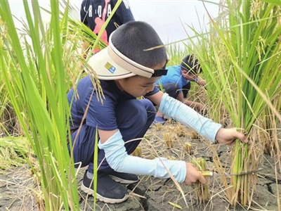 近日,位于金山区廊下镇的节水抗旱稻基地种植的八月香系列新品种“雪花粳”成熟开镰。开镰前,基地还迎来了一群喜爱农业的亲子家庭参与稻谷收割。只见一群群小朋友和家长手拉着手没入成片的稻田中,在科研人员的讲解示范下,手握镰刀,挥汗如雨却乐此不疲地体验着粮食收获的喜悦。作为上海科技节基因园分会场科普活动的重要环节,这场田间实践活动让孩子们收获满满。