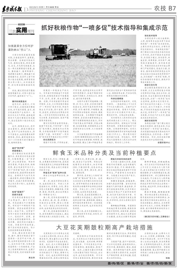 花荚期是大豆从营养生长进入生殖生长期时期,对水分、养分需求较多,需水量约占全生育期的45%。花荚期干旱会造成落花、落荚。此时,是大豆需氮量最多的时期,需氮量占整个生育期的60%左右,虽然根瘤固氮能力强,但仍然满足不了需求,需要补充氮肥。这时,也是对钾肥吸收速度最快的时期,结荚后期吸收达到高峰。