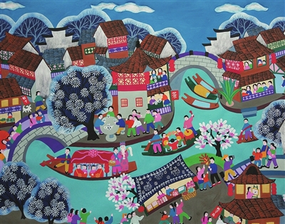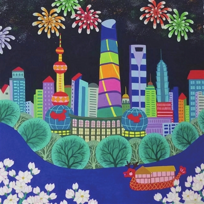 而随着时代的发展,人们的生活在变化,金山农民画的创作同样与时俱进。“实际上,画农民画就像写日记,将生活中美好的画面定格下来。”陈惠方说,不同的创作者,通过农民画可以展示自己的生活。她的作品里有《千年古镇喜事多》记录一场盛大的江南水乡婚礼,有《江南小村》再现小时候的家乡,还有《申城夜色》呈现出新时代黄浦江边的高楼大厦。