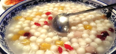 酒酿圆子,是上海传统名点。上海人习惯新年第一顿饭一定要有圆子,意味新年“圆圆满满”,而且要“有汤有水”,寓意“有财有势”。