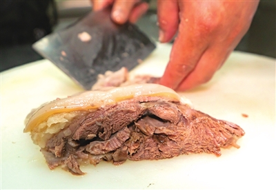 在餐厅后厨,有一间专门为烹调羊肉准备的房间,房内干净整洁,设备齐全,300升的大锅最多可以一次烧煮4只羊。每天清晨,新鲜的羊肉会被送到这里,需要先在清水中浸泡1~2小时浸出血水,随后在沸腾的锅中大火烧半个小时,再转小火焖煮4个小时。焖的过程中还要用专用的网架固定好羊肉,让它不会浮出水面,确保焖煮到位。羊肉烹煮的过程中,只需加入少许食盐,就能完美激发出羊肉本身的香气和滋味,不需要再额外进行调味。“顾客到我们这里,就是想吃到传统农家美食,所以我们坚持传统做法,强调羊肉的新鲜和原汁原味。”顾永豪表示。