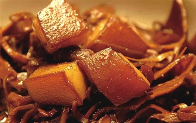 此时在发透之后又经过烧煮的笋干,切丝已轻而易举,金山人吃的笋干都是切得薄而细的笋干丝,笋干越薄,在烧的时候才越容易入味。在烹煮的过程中,笋干烧肉可回锅加热多次,而且回锅后笋干里的油就会慢慢煮出来,越煮越香,吃起来肉酥笋鲜,唇齿留香,回味悠长。