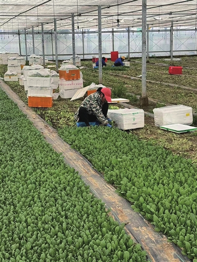上海瑞隆蔬果专业合作社是新陆村蔬菜保供重点基地,大棚内绿叶菜种得满满当当,一片生机盎然的景象。作为第一批“上海市蔬菜‘四新’技术示范基地”之一,合作社通过新品种、新技术、新模式和新装备的引筛示范推广,建设成为技术标杆示范基地。春节期间,该合作社将安排40%的留守人员,确保春节期间生产有序,维持稳定采收与销售。近期,合作社正在加紧可上市蔬菜的采收,日均上市量为2.5吨左右,主要品种为鸡毛菜和生菜。