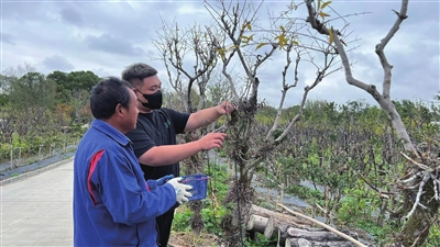 “在果树上种植铁皮石斛,能够让石斛依靠自身根系吸收树体和空气中的营养,减少人工干预以顺应其生物习性,虽然生长较为缓慢,但却是最接近野生环境的生长模式。”黄磊介绍,在决定建设种植基地前,他和父亲已经做过多次数据比对,确定这样的种植方法能够让石斛品质更接近野生,有效成分更富集,经济效益更好。“我们试验过,大棚种植以及在普通树上和果树上面嫁接石斛种苗,然后分别拿去做检测,发现果树上面伴生的石斛,多糖含量要比普通树上伴生长成的高很多。而多糖作为石斛最主要的营养成分,含量越高越好。”为了试验哪种树对石斛种植更有好处,基地分别挑选了桃树、太秋柿树、李树、石榴树等多种果树,并尝试将香椿树经过矮化后种在了设施大棚内做对比试验。