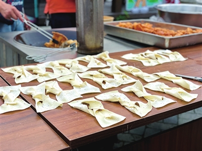 近日,不少嘉定高考生在菊园新区青冈村村民的指导下,亲手制作嘉定传统小食“烤”。手中的面皮经过简单的处理,下入油锅,顿时满园飘香。