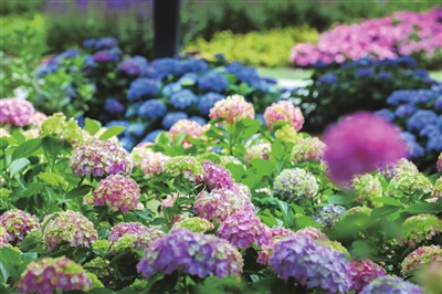 近日,在上海辰山植物园,千余株绣球花开正艳。从淡雅的粉到热烈的红,从清新的蓝到娇艳的紫,各色花朵簇拥在一起,花瓣层层叠叠,相互映衬,绚丽多彩。满园盛放的绣球花不仅带来花团锦簇的视觉享受,也展示着绣球花在城市绿化园艺中多样化的应用场景。