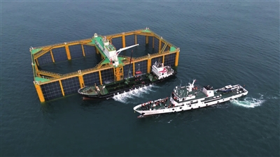 夏日的海面,波光粼粼,微风不燥。从山东省日照市岚山区向海前行,离岸近10海里处,一座巨大的黄色立方体悬浮在水中,这是全国最大的全潜式深远海三文鱼养殖集群式网箱——财金“海上粮仓壹号”系列首座入水网箱。