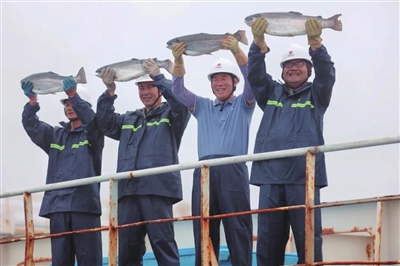 随着指令下达,收鱼工作全面开始。笔者在现场看到工作人员作业热情高涨,他们先用围网聚鱼,一条条肥硕的三文鱼顺着吸鱼管道被传送至养殖工船加工车间。随后,经过电击、割鳃、放血、降温等环节后,捕获的三文鱼被装进转运箱,通过运输船快速送到岸边加工厂,24小时就可以送到消费者的餐桌上,一改我国三文鱼依赖进口、动辄四五天时间跨度的局面。从养殖、捕捞到销售,全程冷链覆盖,最大程度保证了三文鱼肉质的鲜美。