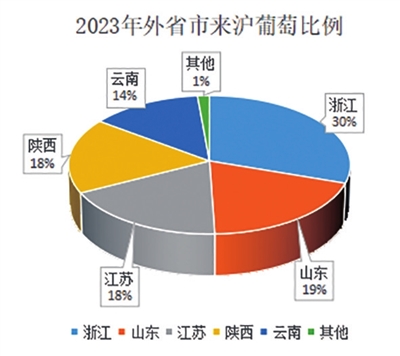 近年来,上海销售外省市葡萄量呈增长趋势,从2013年8万吨增加到2020年的22万吨,2021年、2022年受疫情影响略有回落。进入上海市的葡萄主要来源于浙江、山东、江苏、陕西、云南等省份,2023年,邻近的浙江省已成为上海葡萄的最大输入地;春夏季云南、夏秋季浙江和江苏、晚秋季陕西、辽宁、山东、新疆和河北等地的葡萄先后大量进入上海市场。