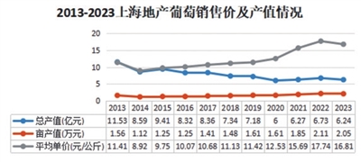 近年来上海地产葡萄的价格呈逐年上涨趋势,十一年平均价格约为12.38元/公斤,平均亩产值约1.57万元。但由于近年来种植面积的大幅减少,上海地产葡萄总产值从2013年的11.53亿元下降到2020年的6亿元,累计下降了近50%,2021年—2023年由于单价高,总产值略有增长。