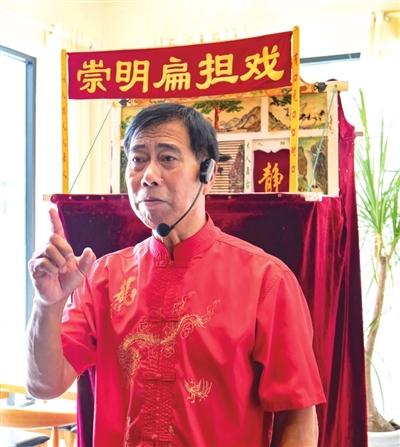 崇明扁担戏属于布袋木偶戏,是崇明的一项著名民俗,被列入上海市非物质文化遗产名录。朱雪山是首批市级非物质文化遗产传承人,自27岁接过祖辈衣钵,传承这项传统技艺,至今已经演了40余年。